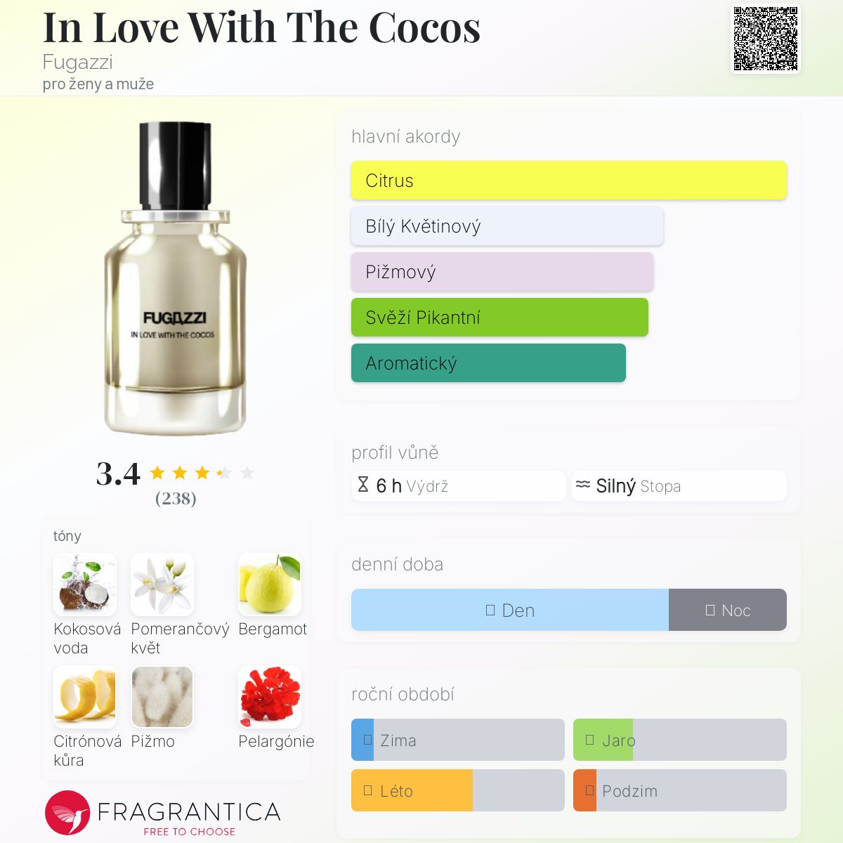 In Love With The Cocos podle Fugazzi je Floral Fruity vůně pro ženy a muže. In Love With The Cocos byl/a uveden/a v roce 2020. Vrchní tóny jsou Bergamot a Citrónová kůra; střední tóny jsouKokosová voda, Pomerančový květ, Pelargónie a Růže ; základní tóny jsou Pižmo, Ambrette (přírodní pižmo) a Jantar (ambra).
