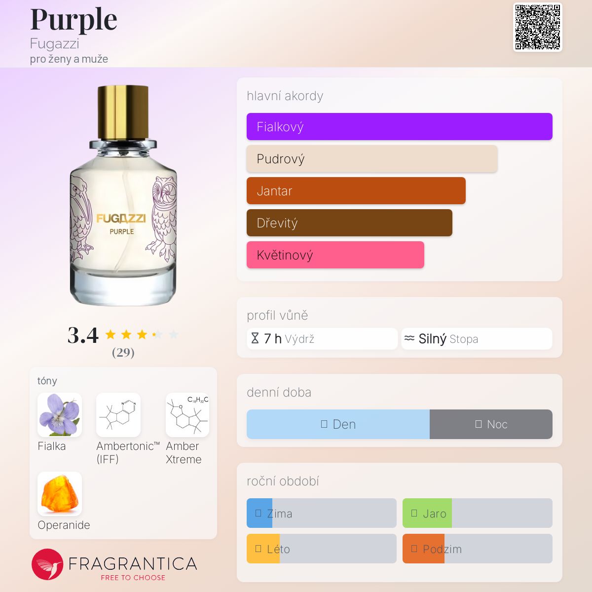 Purple podle Fugazzi je Orientální Floral vůně pro ženy a muže. Toto je nová vůně. Purple byl/a uveden/a v roce 2025. Vrchní tón je Fialka ; střední tón jeAmbertonic ; základní tóny jsou Amber Xtreme a Operanide.