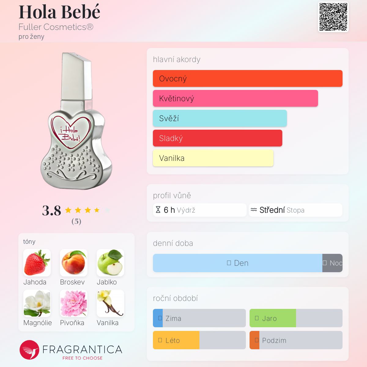 Hola Bebé podle Fuller Cosmetics® je Orientální Floral vůně pro ženy. Vrchní tóny jsou Jahoda, Broskev a Jablko; střední tóny jsouMagnólie a Pivoňka ; základní tóny jsou Vanilka a Bílé dřevo.