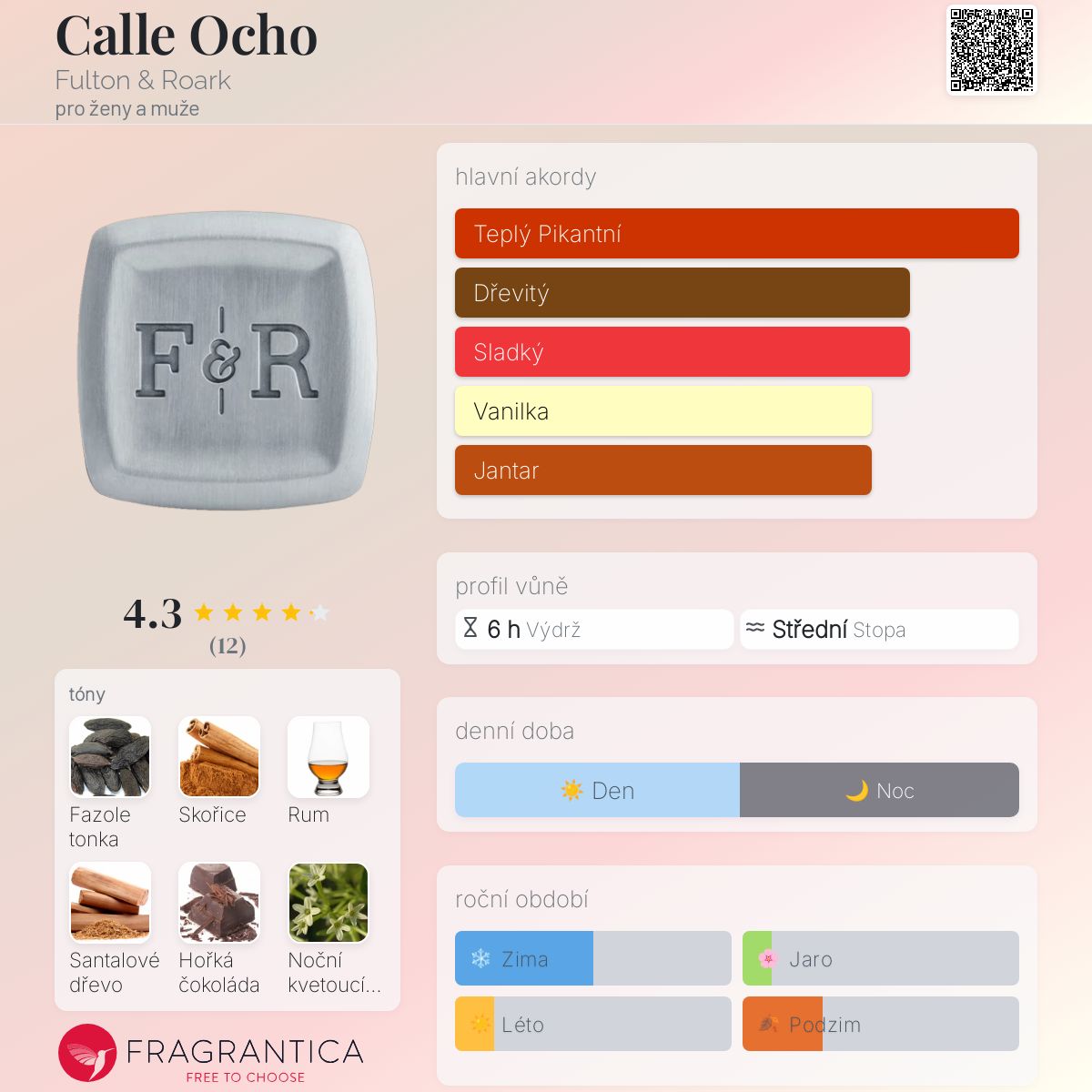 Calle Ocho podle Fulton & Roark je Orientální Vanilla vůně pro ženy a muže. Calle Ocho byl/a uveden/a v roce 2022. "Nosem" za touto vůní je Hamid Merati-Kashani. Vrchní tóny jsou Skořice, Rum a Hořká čokoláda; střední tóny jsouNoční kvetoucí jasmín, Tabák a Labdanum ; základní tóny jsou Fazole tonka, Santalové dřevo a Pižmo.