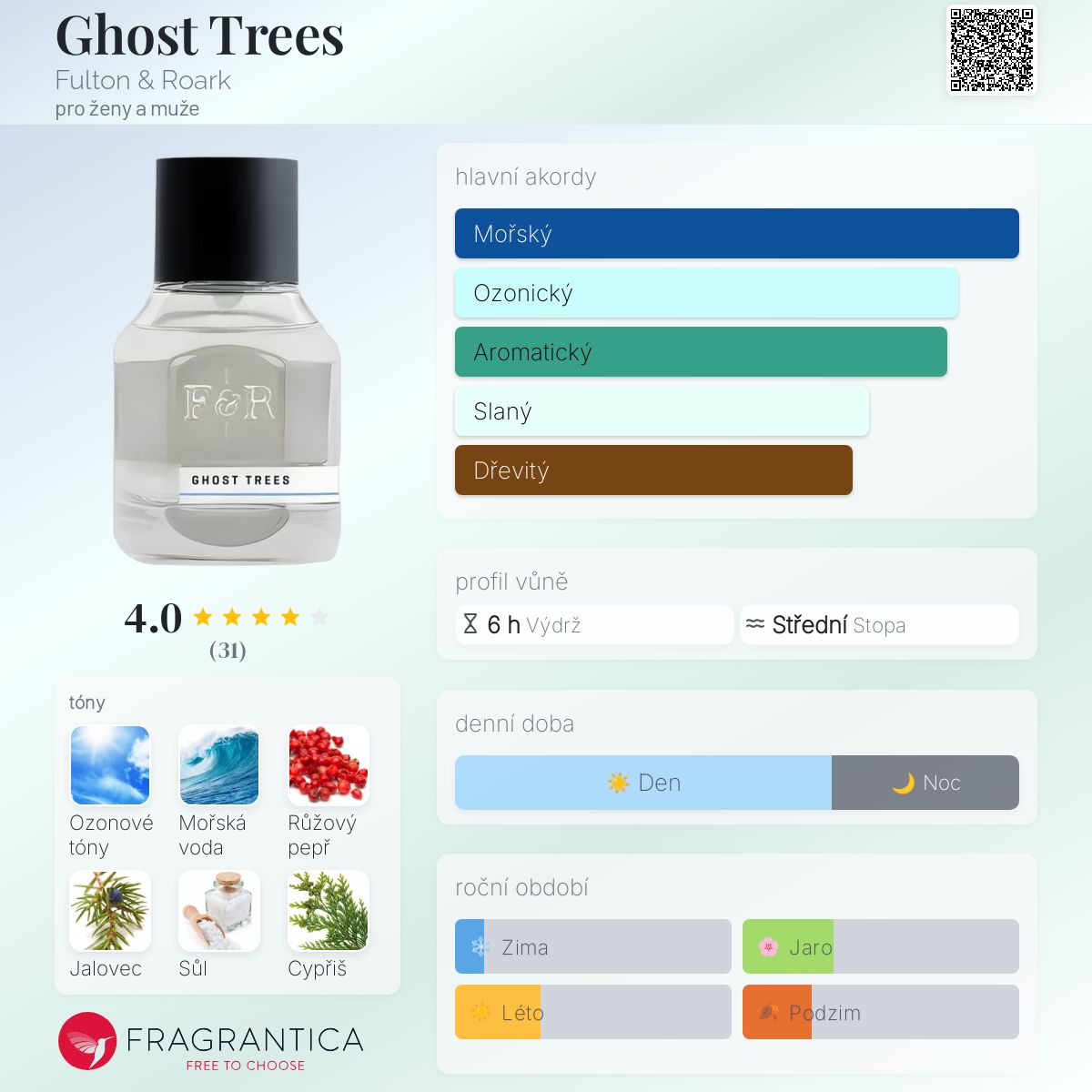 Ghost Trees podle Fulton & Roark je vůně pro ženy a muže. Toto je nová vůně. Ghost Trees byl/a uveden/a v roce 2025. Vrchní tóny jsou Ozonové tóny, Růžový pepř a Jalovec; střední tóny jsouMořské tóny, Sůl, Cypřiš a Květinové tóny ; základní tóny jsou Naplavené dříví, Dřevité tóny a Elemi.