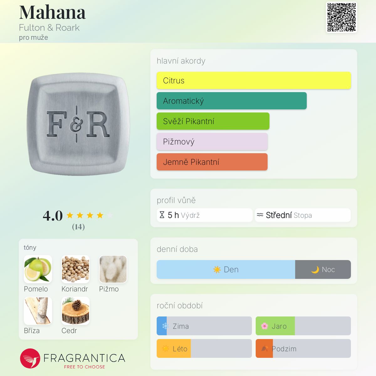 Mahana podle Fulton & Roark je Chypre Fruity vůně pro muže. Mahana byl/a uveden/a v roce 2020. Vrchní tóny jsou Pomelo a Bílé pižmo; střední tóny jsouKoriandr a Březový list ; základní tón je Cedr.