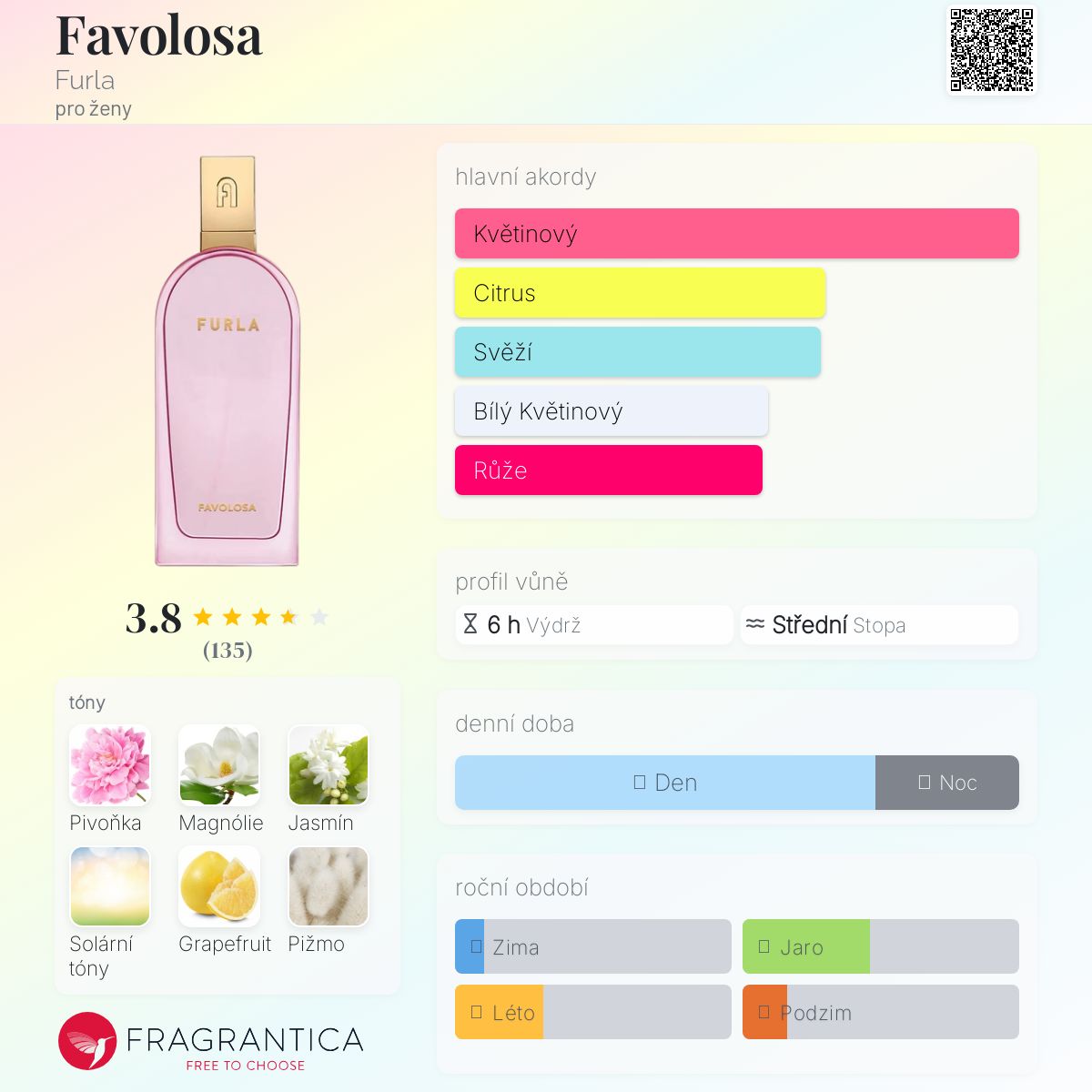 Favolosa podle Furla je Floral Green vůně pro ženy. Favolosa byl/a uveden/a v roce 2020. "Nosem" za touto vůní je Veronique Nyberg. Vrchní tóny jsou Grapefruit, Aksamitník a Zelená mandarinka; střední tóny jsouPivoňka, Magnólie a Jasmín ; základní tóny jsou Solární tóny, Bílé pižmo, Ambroxan a Dřevité tóny.