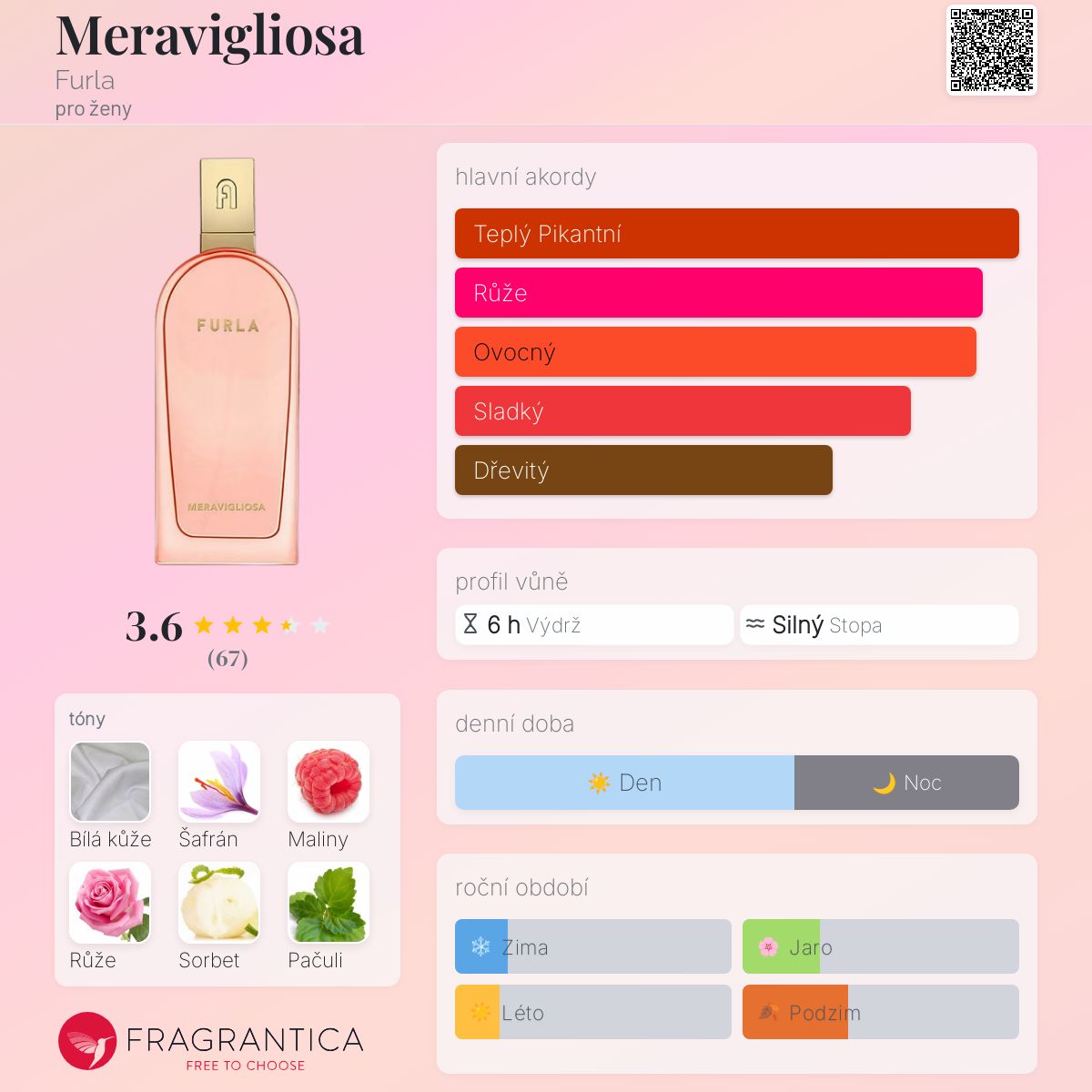 Meravigliosa podle Furla je vůně pro ženy. Meravigliosa byl/a uveden/a v roce 2022. Vrchní tóny jsou Šafrán, Maliny a Sorbet; střední tóny jsouBílá kůže a Růže ; základní tóny jsou Pačuli a Santalové dřevo.