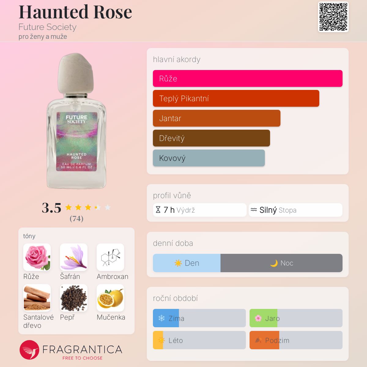 Haunted Rose podle Future Society je Floral Green vůně pro ženy a muže. Haunted Rose byl/a uveden/a v roce 2023. "Nosem" za touto vůní je Jérôme Epinette. Vrchní tóny jsou Šafrán a Černý pepř; střední tóny jsouRůže a Mučenka ; základní tóny jsou Ambroxan a Santalové dřevo.