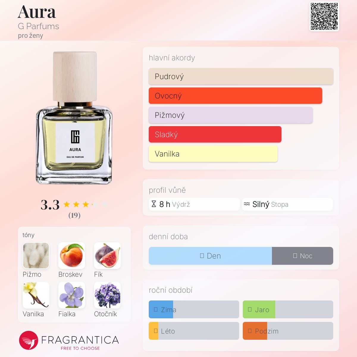 Aura podle G Parfums je Floral vůně pro ženy. Aura byl/a uveden/a v roce 2015. "Nosem" za touto vůní je Oleg Grabchuk. Vrchní tóny jsou Broskev, Růže a Jasmín; střední tóny jsouFík, Fialka, Otočník, Liči a Vonokvětka ; základní tóny jsou Pižmo, Vanilka a Kosatec.