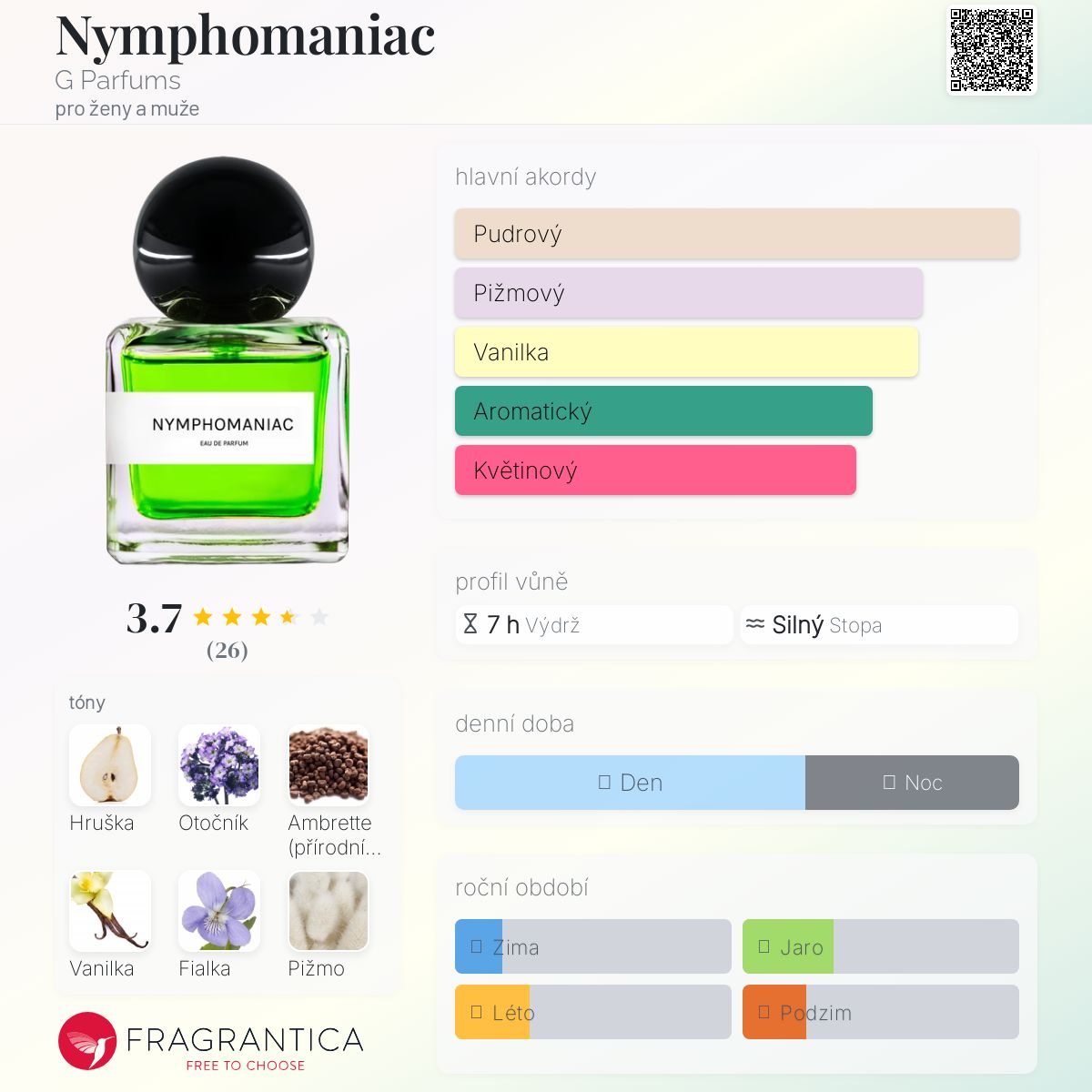 Nymphomaniac podle G Parfums je vůně pro ženy a muže. Nymphomaniac byl/a uveden/a v roce 2018. "Nosem" za touto vůní je Oleg Grabchuk.