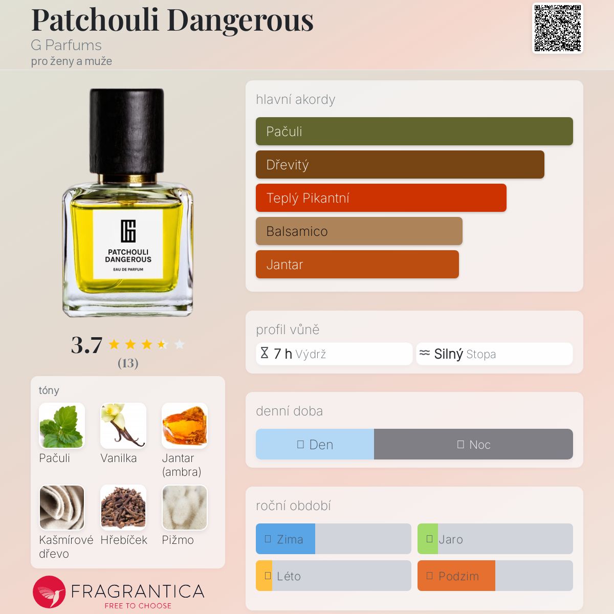 Patchouli Dangerous podle G Parfums je Orientální Woody vůně pro ženy a muže. Patchouli Dangerous byl/a uveden/a v roce 2015. "Nosem" za touto vůní je Oleg Grabchuk. Vrchní tón je Jasmín ; střední tóny jsouKašmírové dřevo, Hřebíček, Guajakové dřevo a Týkové dřevo ; základní tóny jsou Pačuli, Vanilka, Jantar (ambra) a Pižmo.