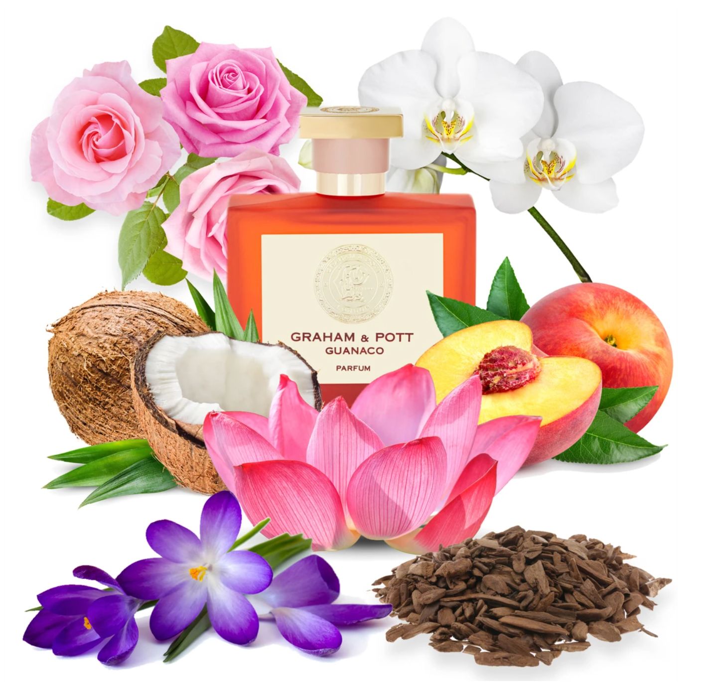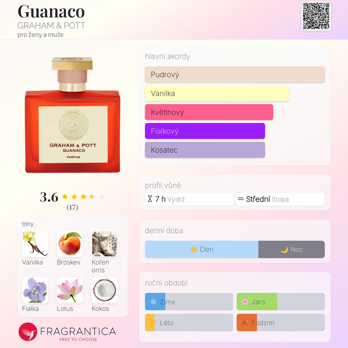 Guanaco podle GRAHAM & POTT je vůně pro ženy a muže. Guanaco byl/a uveden/a v roce 2021. Vrchní tóny jsou Broskev, Lotus a Kokos; střední tóny jsouKořen orris, Fialka a Růže ; základní tóny jsou Vanilka, Pižmo a Agarové dřevo (oud).