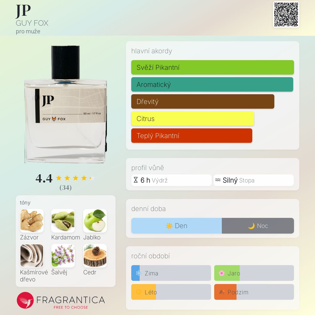 JP podle GUY FOX je Aromatic vůně pro muže. JP byl/a uveden/a v roce 2018. Vrchní tóny jsou Zázvor, Kardamom, Bergamot a Grapefruit; střední tóny jsouJablko, Šalvěj, Pelargónie a Růže ; základní tóny jsou Kašmírové dřevo, Cedr a Vetiver.
