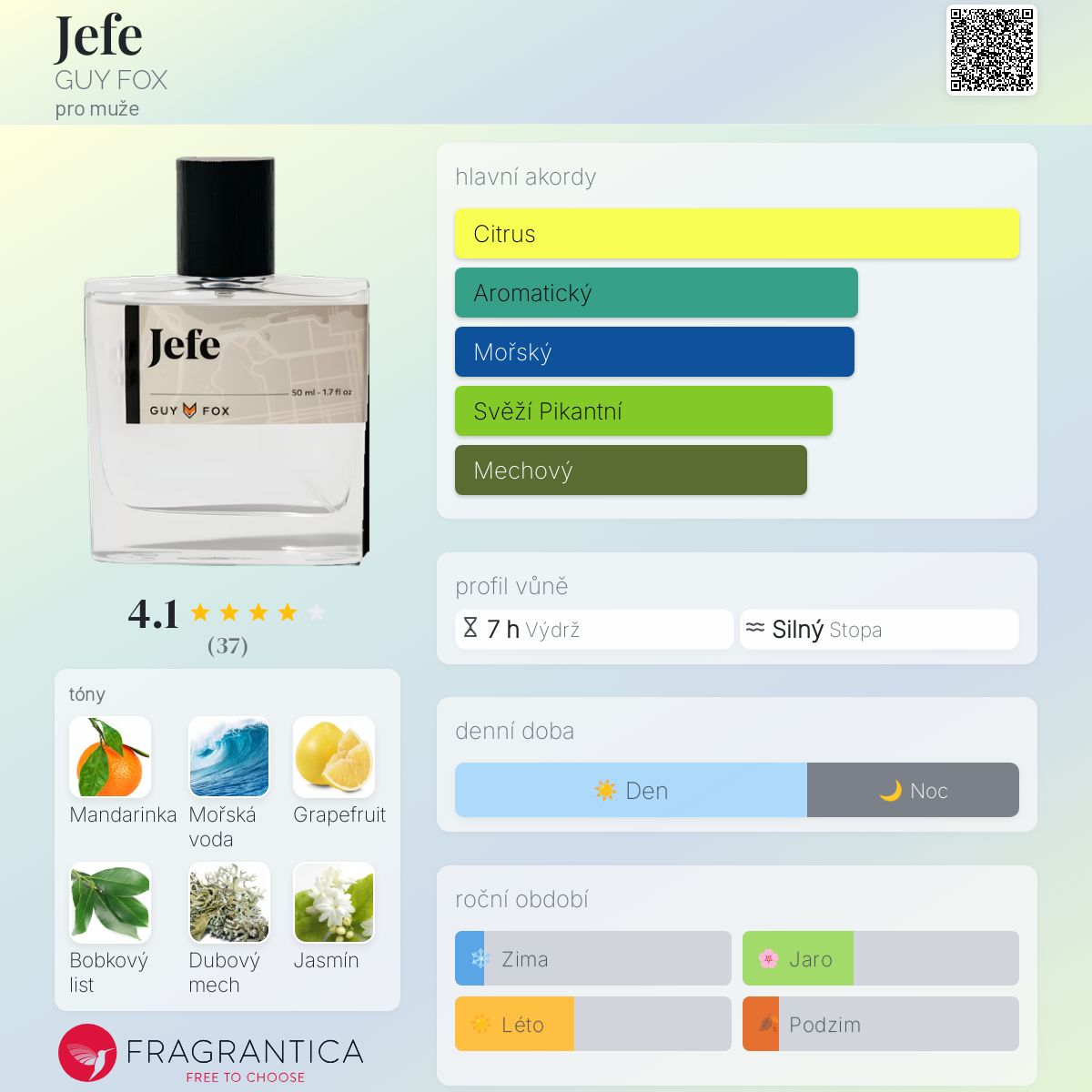 Jefe podle GUY FOX je Aromatic Aquatic vůně pro muže. Jefe byl/a uveden/a v roce 2018. Vrchní tóny jsou Mandarinka, Mořské tóny a Grapefruit; střední tóny jsouBobkový list a Jasmín ; základní tóny jsou Dubový mech, Ambra, Pačuli a Guajakové dřevo.