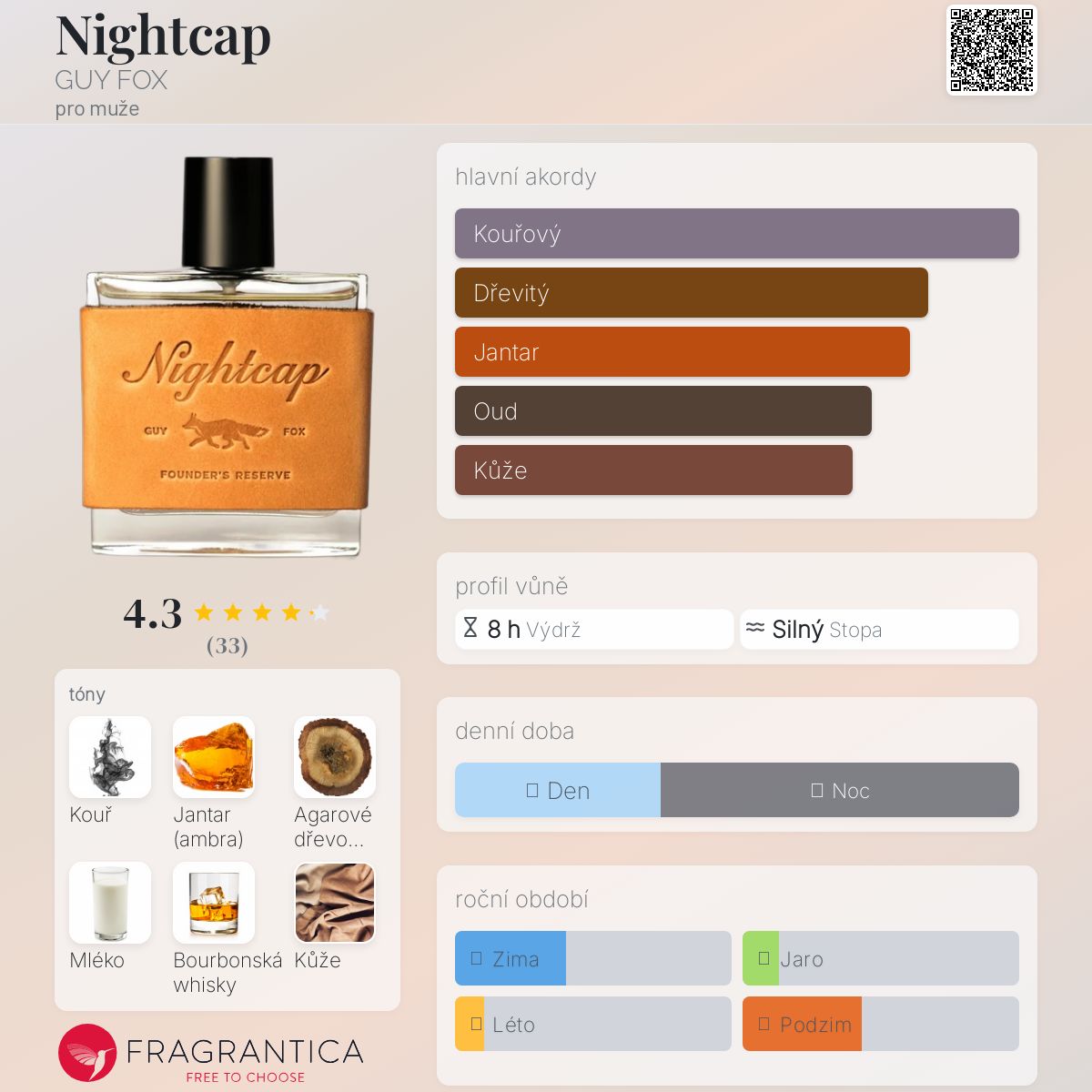 Nightcap podle GUY FOX je Orientální Spicy vůně pro muže. Toto je nová vůně. Nightcap byl/a uveden/a v roce 2024. Nightcap byl/a vytvořen/a Marc Daniel Heimgartner a Sidonie Grandperret. Vrchní tóny jsou Tabák, Hořký pomeranč, Slad, Muškátový oříšek, Koriandr a Zázvor; střední tóny jsouAgarové dřevo (oud), Mléko, Bourbonská whisky, Kůže, Dub a Jamajský pepř ; základní tóny jsou Kouř, Jantar (ambra), Vanilka, Santalové dřevo a Bílé pižmo.