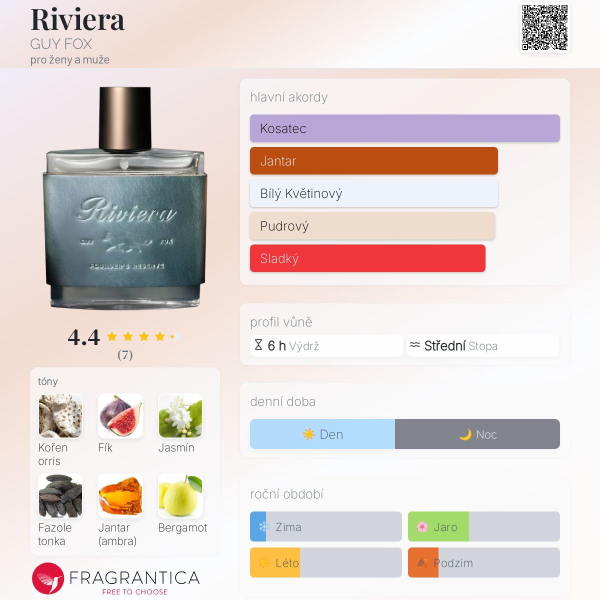 Riviera podle GUY FOX je Orientální Floral vůně pro ženy a muže. Toto je nová vůně. Riviera byl/a uveden/a v roce 2024. "Nosem" za touto vůní je Jim Breznitsky. Vrchní tóny jsou Fík a Bergamot; střední tóny jsouOrris a Jasmín ; základní tóny jsou Fazole tonka, Jantar (ambra), Santalové dřevo a Pižmo.