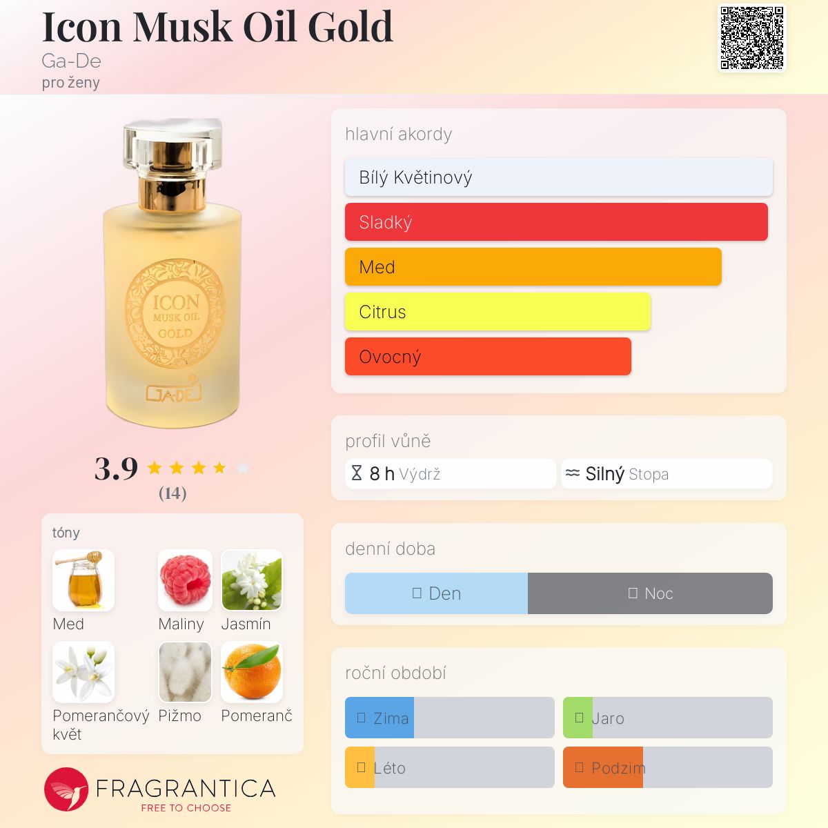 Icon Musk Oil Gold podle Ga-De je vůně pro ženy. Vrchní tóny jsou Pomeranč, Neroli a Grapefruit; střední tóny jsouMed, Jasmín Sambac, Pomerančový květ a Gardénie ; základní tóny jsou Maliny, Pižmo, Vanilka a Pačuli.