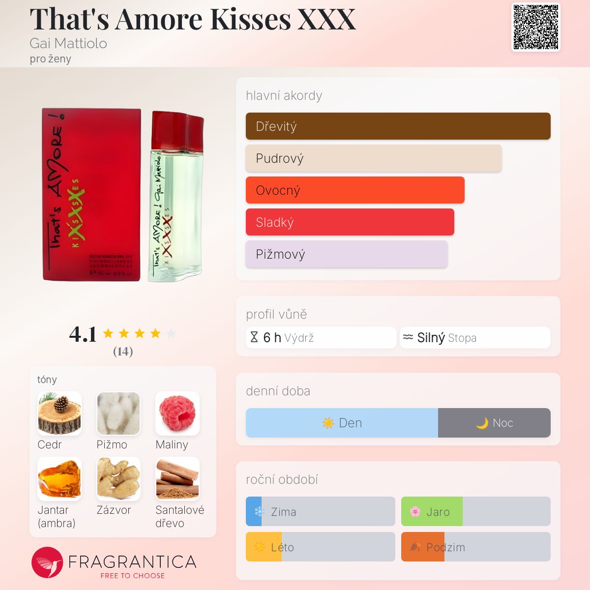 That's Amore Kisses XXX podle Gai Mattiolo je Orientální Floral vůně pro ženy. That's Amore Kisses XXX byl/a uveden/a v roce 2002. Vrchní tóny jsou Citrusy, Černý rybíz, Mandarinka a Bergamot; střední tóny jsouMaliny, Zázvor, Ylang-Ylang, Růže, Fialkový list, Muškátový oříšek, Fialka a Frézie ; základní tóny jsou Virginský cedr, Pižmo, Jantar (ambra), Santalové dřevo a Vanilka.