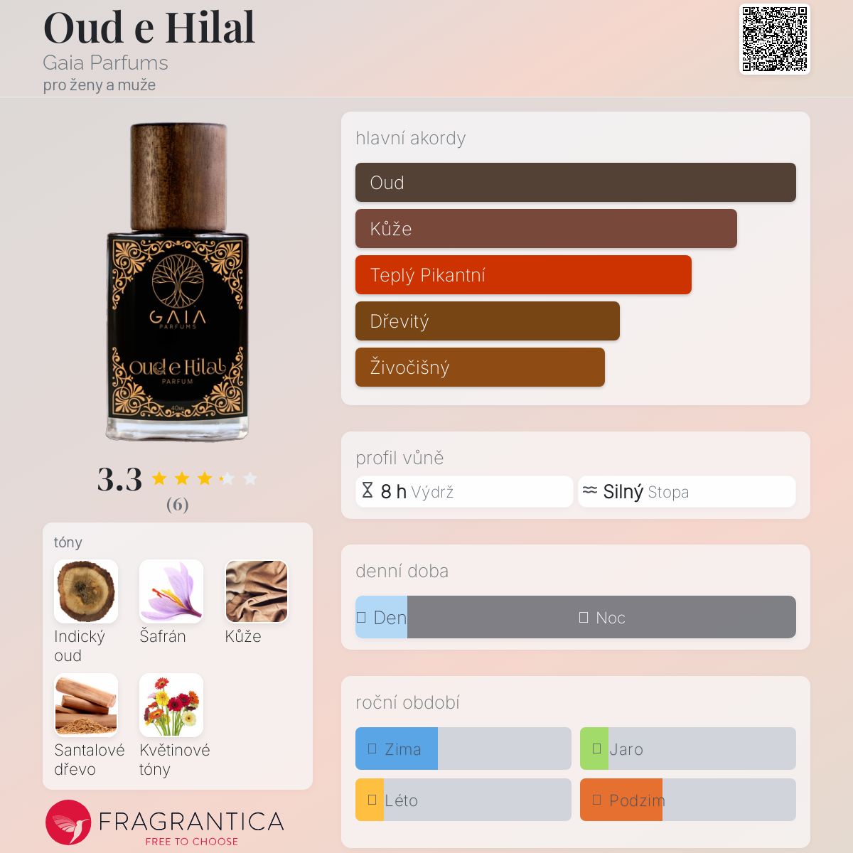 Oud e Hilal podle Gaia Parfums je Woody vůně pro ženy a muže. Oud e Hilal byl/a uveden/a v roce 2022. "Nosem" za touto vůní je Hussam Masood.