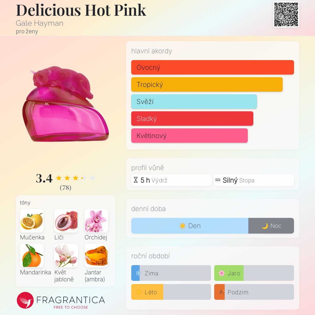 Delicious Hot Pink podle Gale Hayman je Floral Fruity vůně pro ženy. Delicious Hot Pink byl/a uveden/a v roce 2012. Vrchní tóny jsou Mučenka, Liči a Mandarinka; střední tóny jsouBílá orchidej, Květ jabloně a Jasmín ; základní tóny jsou Bílý jantar (ambra), Pižmo a Naplavené dříví.