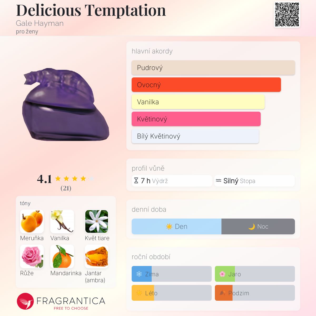 Delicious Temptation podle Gale Hayman je Floral Fruity vůně pro ženy. Vrchní tóny jsou Meruňka a Mandarinka; střední tóny jsouKvět tiare, Tinktura z růže a Frézie ; základní tóny jsou Vanilka, Jantar (ambra), Santalové dřevo a Pižmo.