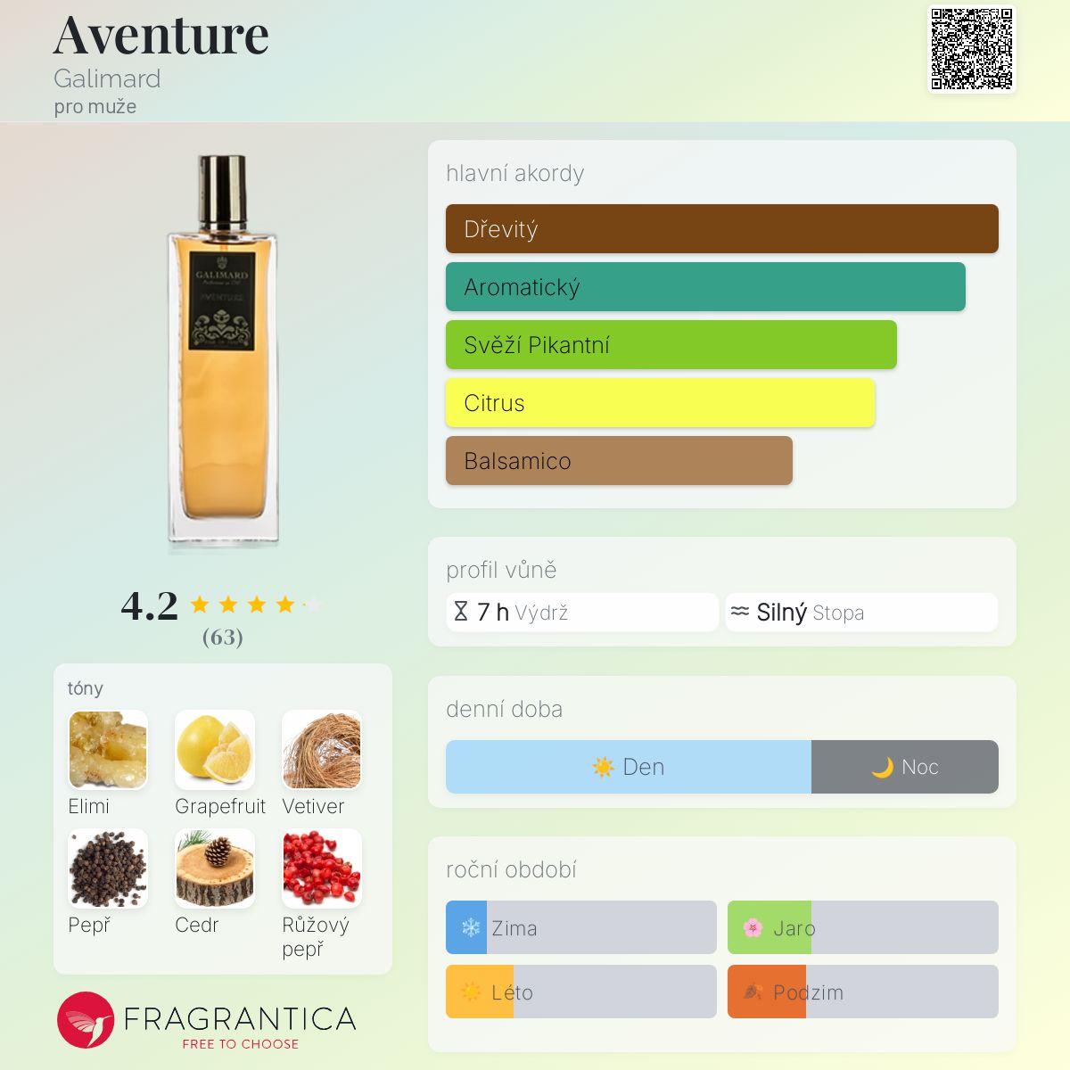 Aventure podle Galimard je Aromatic Spicy vůně pro muže. Vrchní tóny jsou Elimi, Grapefruit, Černý pepř a Růžový pepř; střední tóny jsouVetiver, Marocký cedr a Pačuli ; základní tóny jsou Jantar (ambra), Santalové dřevo a Bourbonská vanilka.