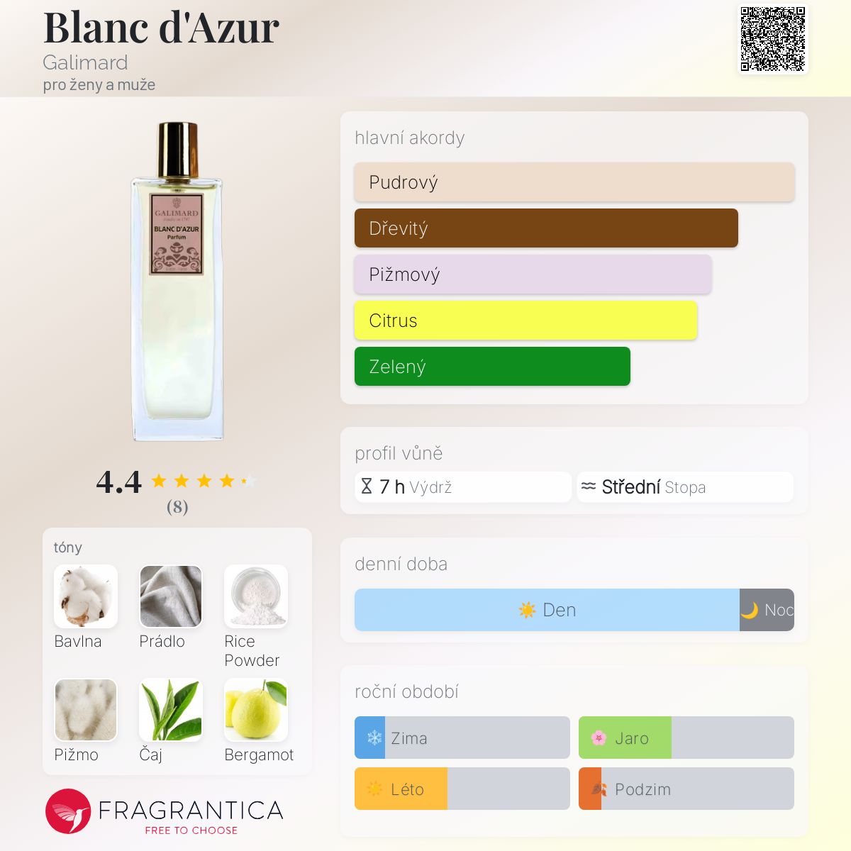 Blanc d'Azur podle Galimard je vůně pro ženy a muže. Toto je nová vůně. Blanc d'Azur byl/a uveden/a v roce 2025. Vrchní tóny jsou Zelený čaj a Bergamot; střední tóny jsouBavlna, Prádlo a Neroli ; základní tóny jsou Rice Powder, Bílé pižmo, Santalové dřevo a Cedr.