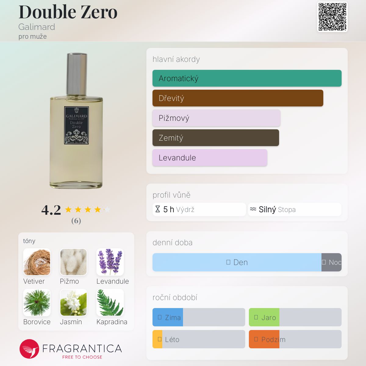 Double Zero podle Galimard je Aromatic Fougere vůně pro muže. Vrchní tóny jsou Levandule, Kapradina a Citrón; střední tóny jsouBorovice a Jasmín ; základní tóny jsou Vetiver a Pižmo.