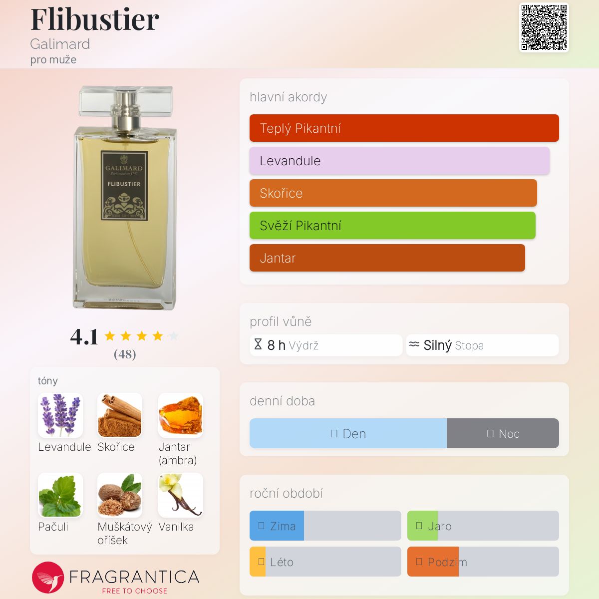 Flibustier podle Galimard je Aromatic Fougere vůně pro muže. Vrchní tóny jsou Levandule, Bergamot a Citron amalfi; střední tóny jsouSkořice, Pačuli a Muškátový oříšek ; základní tóny jsou Jantar (ambra), Vanilka, Vetiver a Dubový mech.