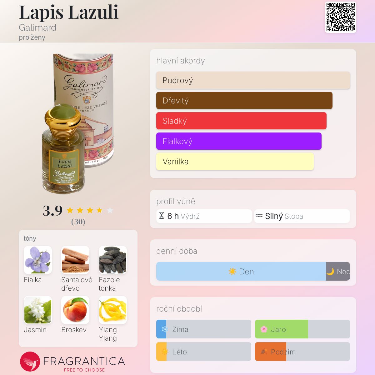 Lapis Lazuli podle Galimard je Floral Fruity vůně pro ženy. Vrchní tóny jsou Broskev a Maliny; střední tóny jsouFialka, Jasmín a Ylang-Ylang ; základní tóny jsou Santalové dřevo, Fazole tonka a Vanilka.