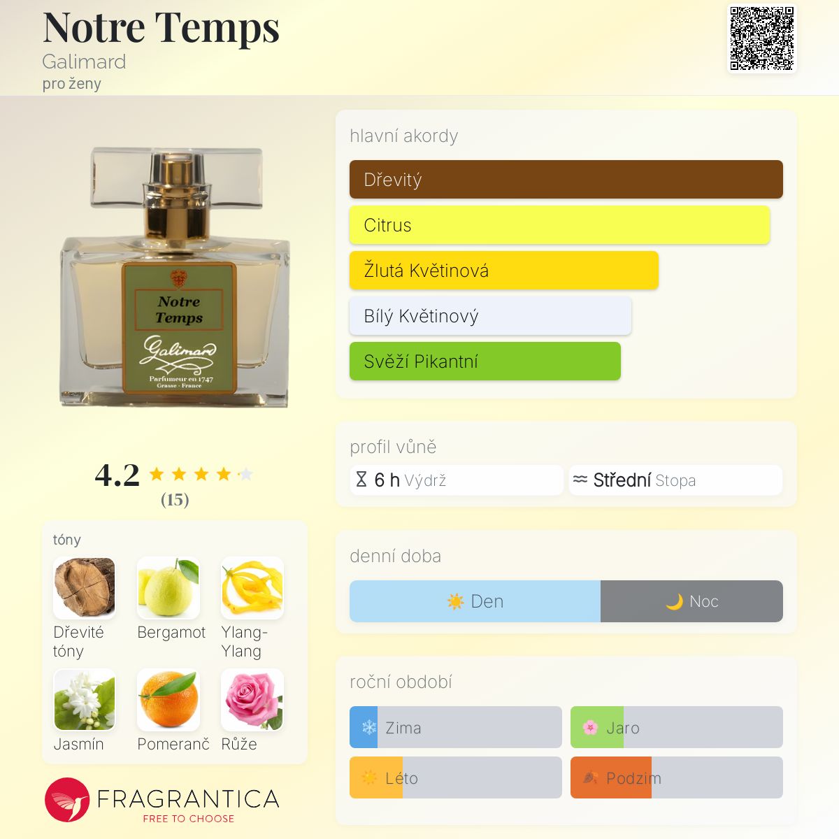 Notre Temps podle Galimard je Floral Woody Musk vůně pro ženy. Vrchní tóny jsou Bergamot a Pomeranč; střední tóny jsouYlang-Ylang, Jasmín a Růže ; základní tóny jsou Vzácné dřevo a Pižmo.