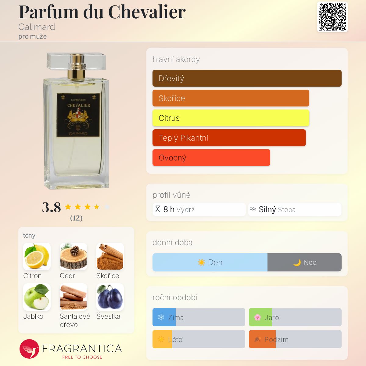 Parfum du Chevalier podle Galimard je Orientální Woody vůně pro muže. Parfum du Chevalier byl/a uveden/a v roce 2014. "Nosem" za touto vůní je Caroline de Boutiny. Vrchní tóny jsou Citrón, Zelené jablko a Švestka; střední tóny jsouCedr a Skořice ; základní tóny jsou Santalové dřevo a Vanilka.