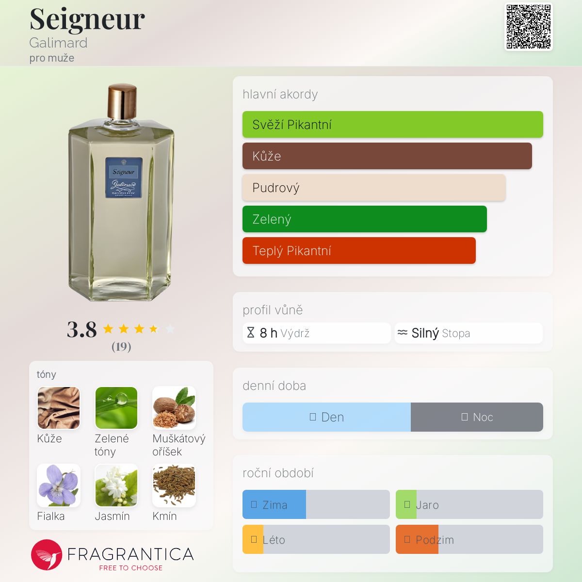Seigneur podle Galimard je Chypre vůně pro muže. Vrchní tóny jsou Zelené tóny, Mandarinka a Fialkový list; střední tóny jsouMuškátový oříšek, Fialka, Jasmín, Kmín a Hřebíček ; základní tóny jsou Kůže, Pačuli, Vanilka, Pižmo a Cedr.