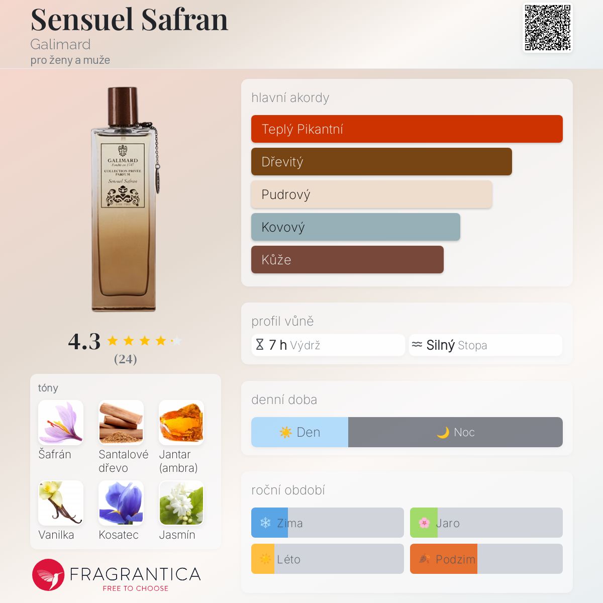 Sensuel Safran podle Galimard je Woody Aquatic vůně pro ženy a muže. Sensuel Safran byl/a uveden/a v roce 2017. Vrchní tóny jsou Šafrán a Sicilský citron; střední tóny jsouKosatec, Jasmín, Pačuli a Okvětní lístky růží ; základní tóny jsou Santalové dřevo, Jantar (ambra), Madagaskarská vanilka, Cedr, Bílé pižmo a Dubový mech.