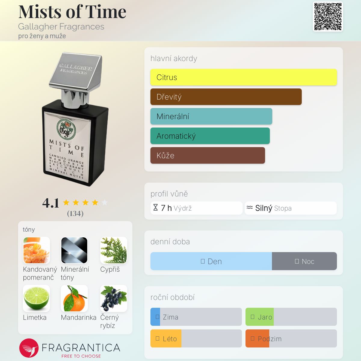 Vyzkoušela jsem si nejnovější vůni od Gallagher Fragrances, Mists of Time, svěží, ostrou, ovocnou, dřevitou a lehce pižmovou směs, kterou mám trochu problém zařadit, i když rozdělení tónů odpovídá mým dojmům z ní. Je tu pomeranč (i když já osobně cítím spíš hořký pomeranč než kandovaný pomeranč), trochu sladšího ovoce v podobě černého rybízu, cypřiše/břízy pro smíšenou zelenou/dřevitou/kouřovou kvalitu a suchý spodek minerálních tónů (kterým přisuzuji část trvalé ostrosti), pižma a vanilky.