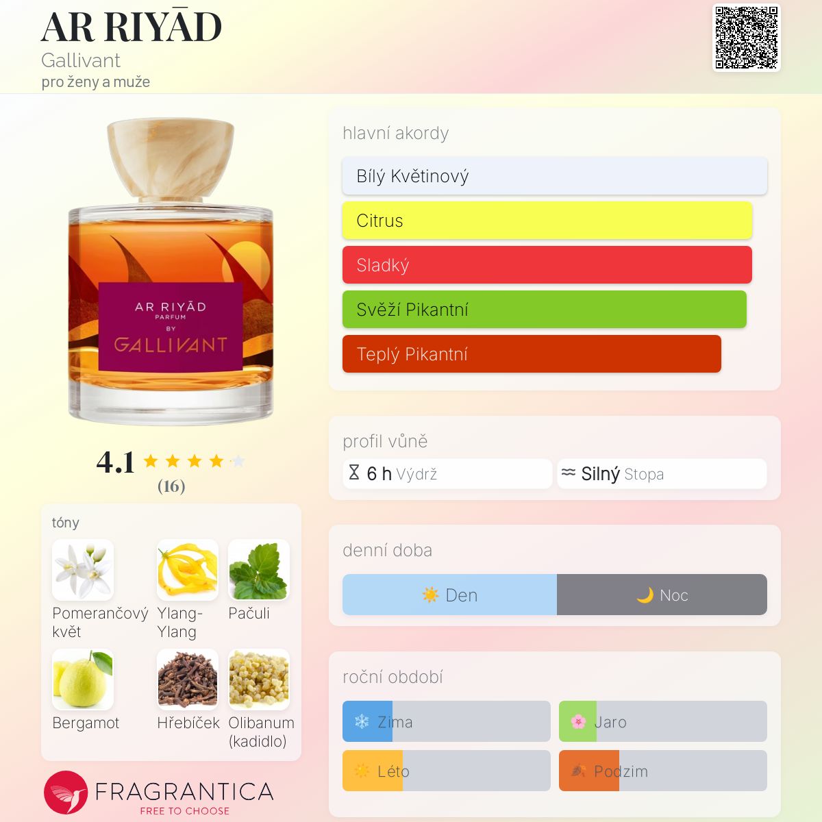 AR RIYĀD podle Gallivant je Orientální Spicy vůně pro ženy a muže. Toto je nová vůně. AR RIYĀD byl/a uveden/a v roce 2025. "Nosem" za touto vůní je Celine Perdriel. Vrchní tóny jsou Bergamot, Zázvor, Hořká mandle a Sporýš; střední tóny jsouPomerančový květ, Ylang-Ylang, Hřebíček, Muškátový oříšek a Kmín ; základní tóny jsou Pačuli, Olibanum, Tabák a Vanilka.