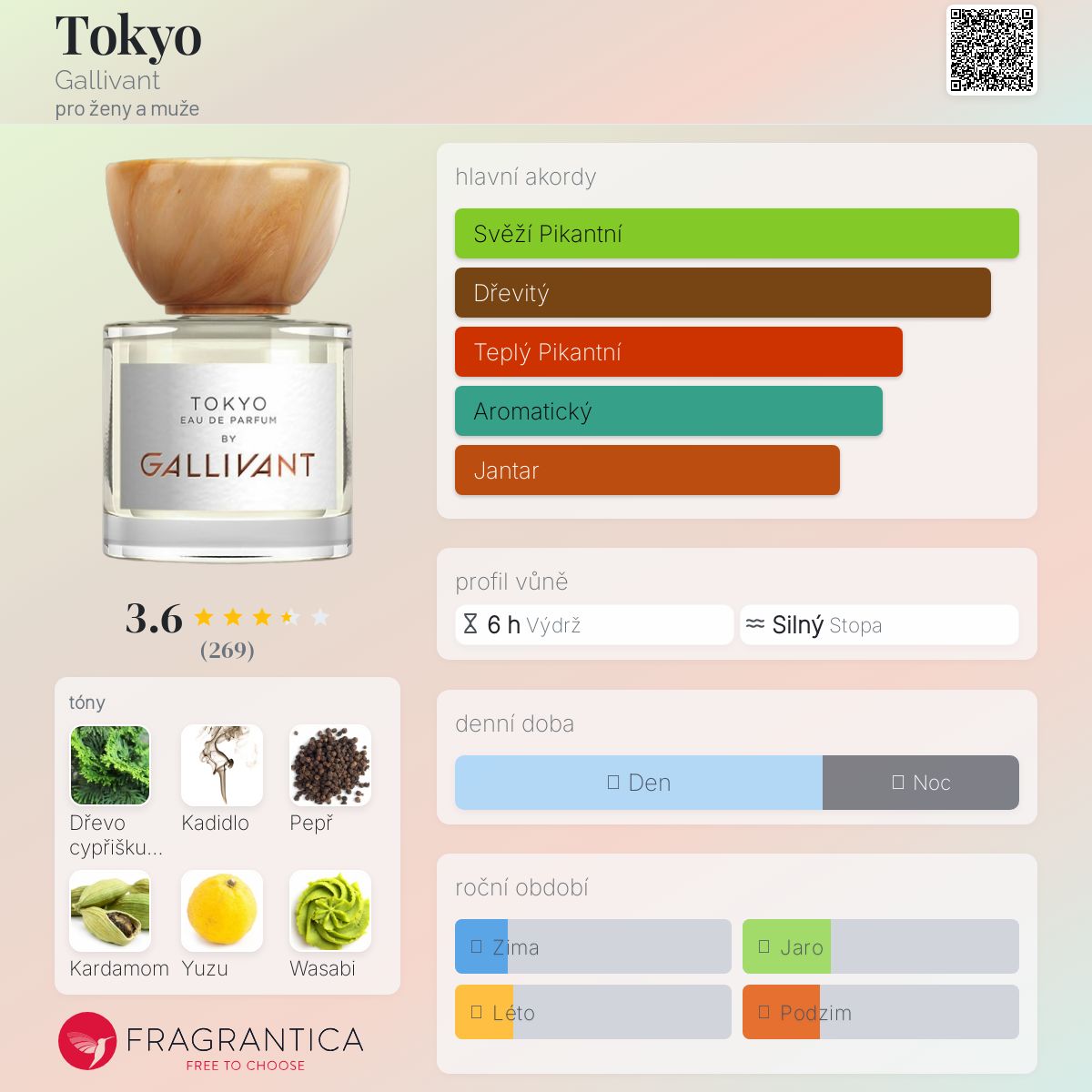Tokyo podle Gallivant je Woody Spicy vůně pro ženy a muže. Tokyo byl/a uveden/a v roce 2018. "Nosem" za touto vůní je Nicolas Bonneville. Vrchní tóny jsou Černý pepř, Kardamom, Yuzu, Wasabi a Bergamot; střední tóny jsouCypřišek tupolistý, Kadidlo, Muškátový oříšek, Cedr, Kosatec a Růže ; základní tóny jsou Santalové dřevo, Jantar (ambra), Vetiver a Pačuli.