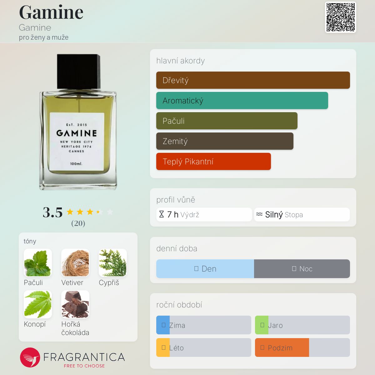Gamine podle Gamine je Woody vůně pro ženy a muže. Gamine byl/a uveden/a v roce 2016. "Nosem" za touto vůní je Claude Dir.