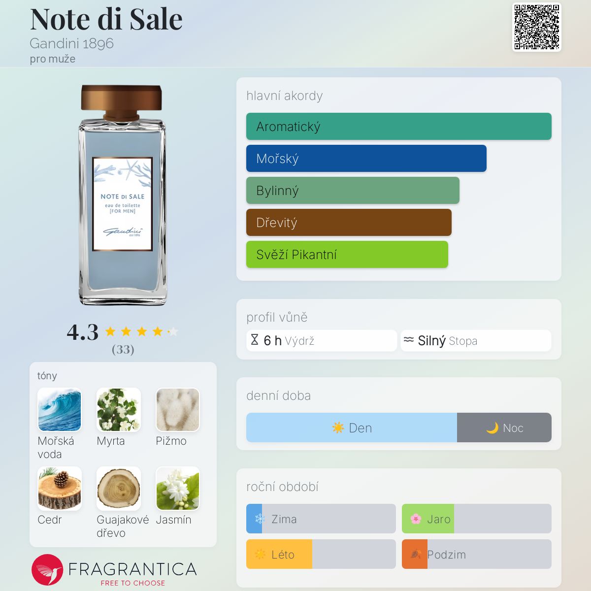 Note di Sale podle Gandini 1896 je Woody Aquatic vůně pro muže. Vrchní tón je Mořské tóny ; střední tóny jsouMyrta a Jasmín ; základní tóny jsou Pižmo, Cedr, Guajakové dřevo a Fazole tonka.