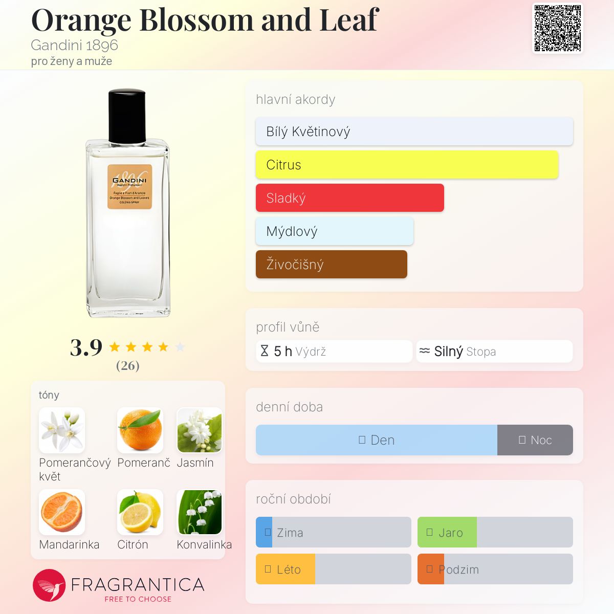 Orange Blossom and Leaf podle Gandini 1896 je Citrus vůně pro ženy a muže. Orange Blossom and Leaf byl/a uveden/a v roce 2010. Vrchní tóny jsou Pomeranč, Mandarinka a Citron amalfi; střední tóny jsouKvět afrického pomeranče, Jasmín a Konvalinka ; základní tóny jsou Vetiver a Virginský cedr.