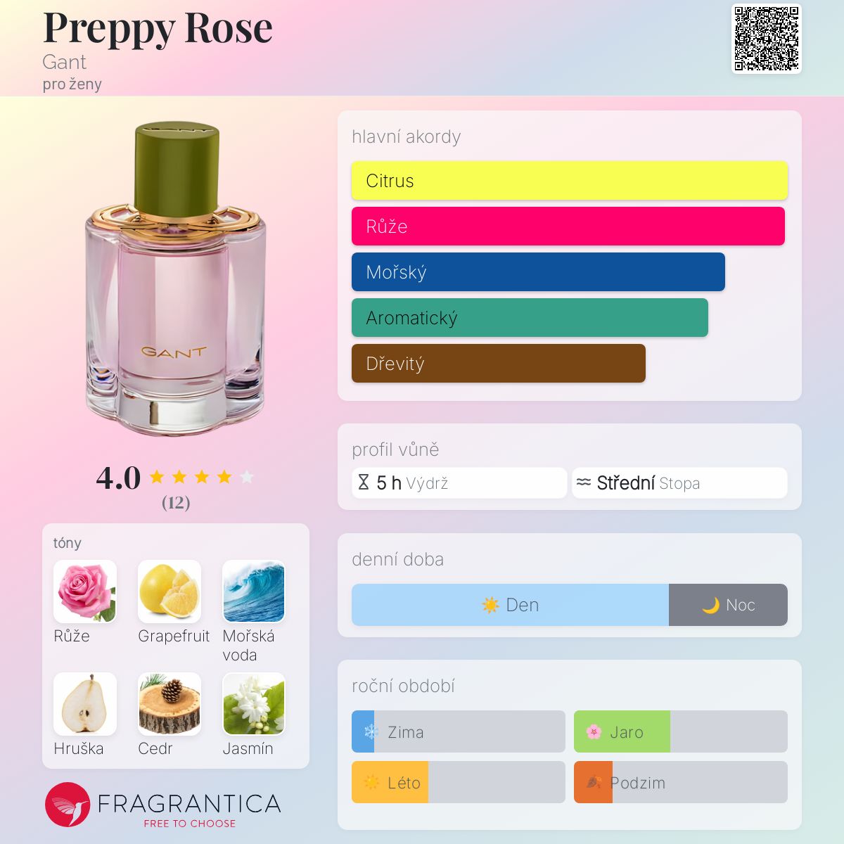 Preppy Rose podle Gant je Floral Aquatic vůně pro ženy. Toto je nová vůně. Preppy Rose byl/a uveden/a v roce 2025. Vrchní tóny jsou Grapefruit a Hruška; střední tóny jsouRůže, Jasmín a Neroli ; základní tóny jsou Mořské tóny, Cedr a Santalové dřevo.