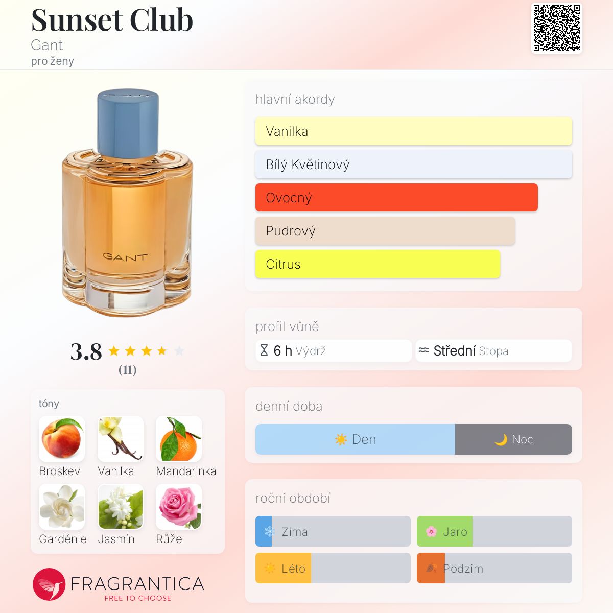 Sunset Club podle Gant je Floral Fruity vůně pro ženy. Toto je nová vůně. Sunset Club byl/a uveden/a v roce 2025. Vrchní tóny jsou Broskev a Mandarinka; střední tóny jsouGardénie, Jasmín a Růže ; základní tóny jsou Vanilka a Pižmo.