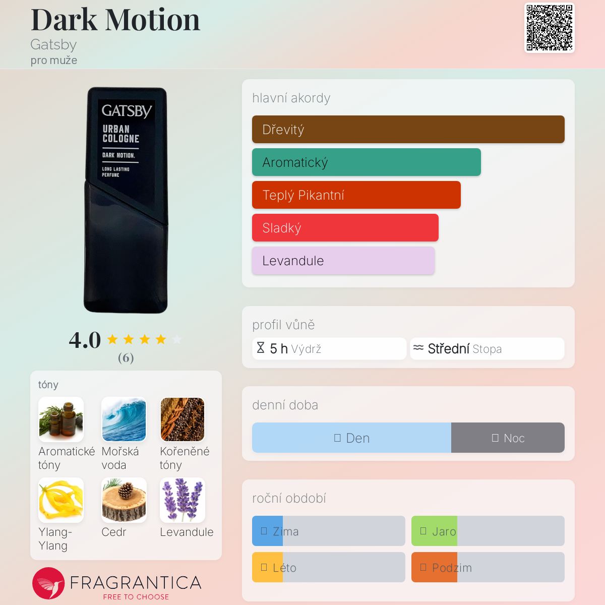 Dark Motion podle Gatsby je vůně pro muže. Vrchní tóny jsou Aromatické tóny, Mořské tóny a Koření; střední tóny jsouYlang-Ylang, Cedr, Levandule a Jantar (ambra) ; základní tóny jsou Kumarin, Santalové dřevo, Jantar (ambra) a Mech.