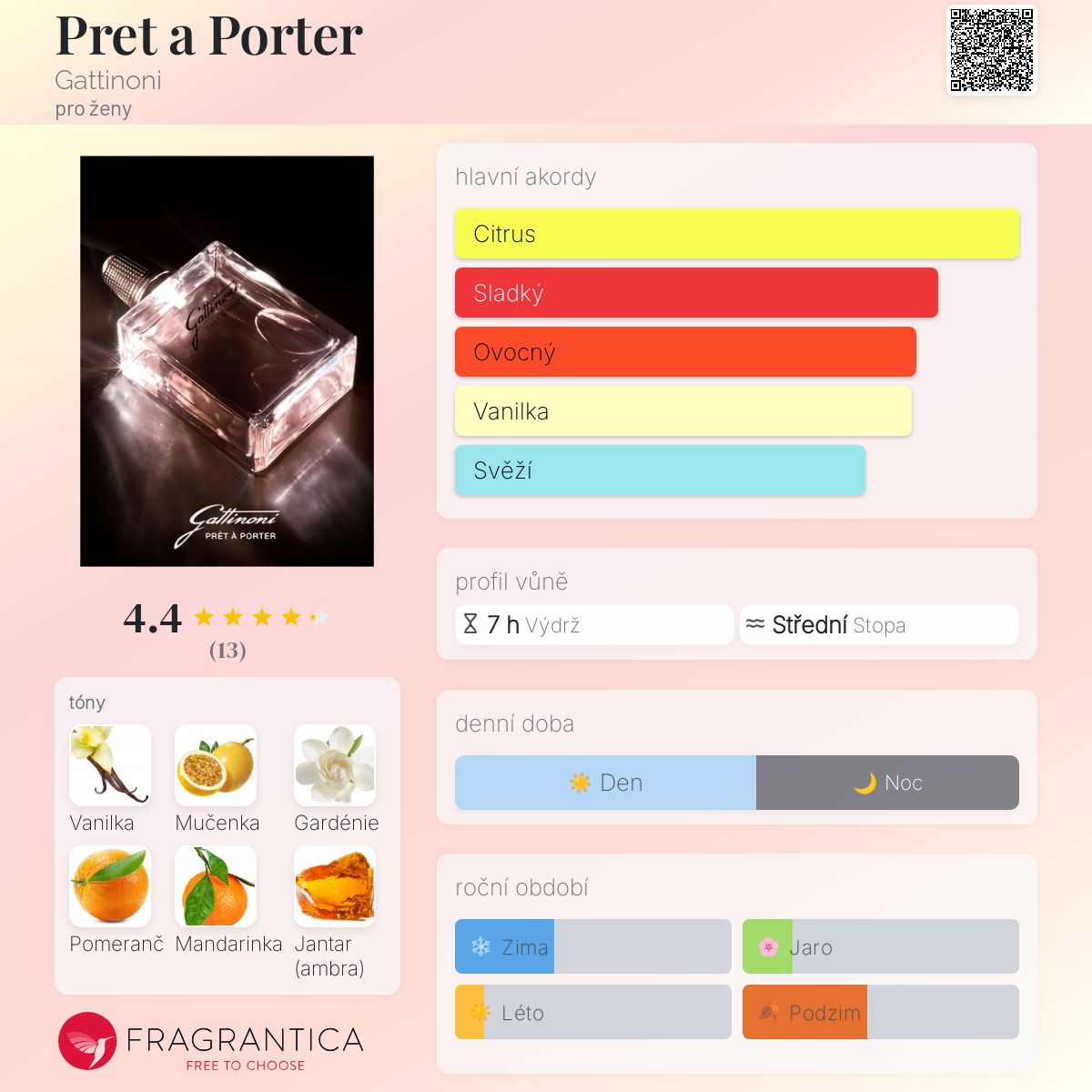 Pret a Porter podle Gattinoni je Floral Fruity vůně pro ženy. Pret a Porter byl/a uveden/a v roce 2007. "Nosem" za touto vůní je Maarten K.J. Shoute. Vrchní tóny jsou Mučenka, Pomeranč, Mandarinka, Maliny, Bergamot, Citrón a Vodní meloun; střední tóny jsouGardénie, Leknín a Pivoňka ; základní tóny jsou Vanilka, Jantar (ambra) a Pižmo.