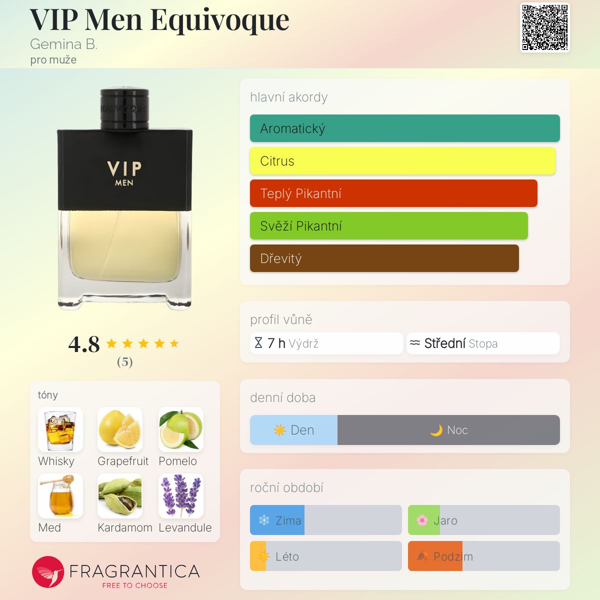 VIP Men Equivoque podle Gemina B. je Leather vůně pro muže. VIP Men Equivoque byl/a uveden/a v roce 2014. Vrchní tóny jsou Whisky, Grapefruit, Pomelo a Med; střední tóny jsouKardamom, Levandule, Kmín a Šalvěj ; základní tóny jsou Benzoin, Dřevité tóny a Kůže.