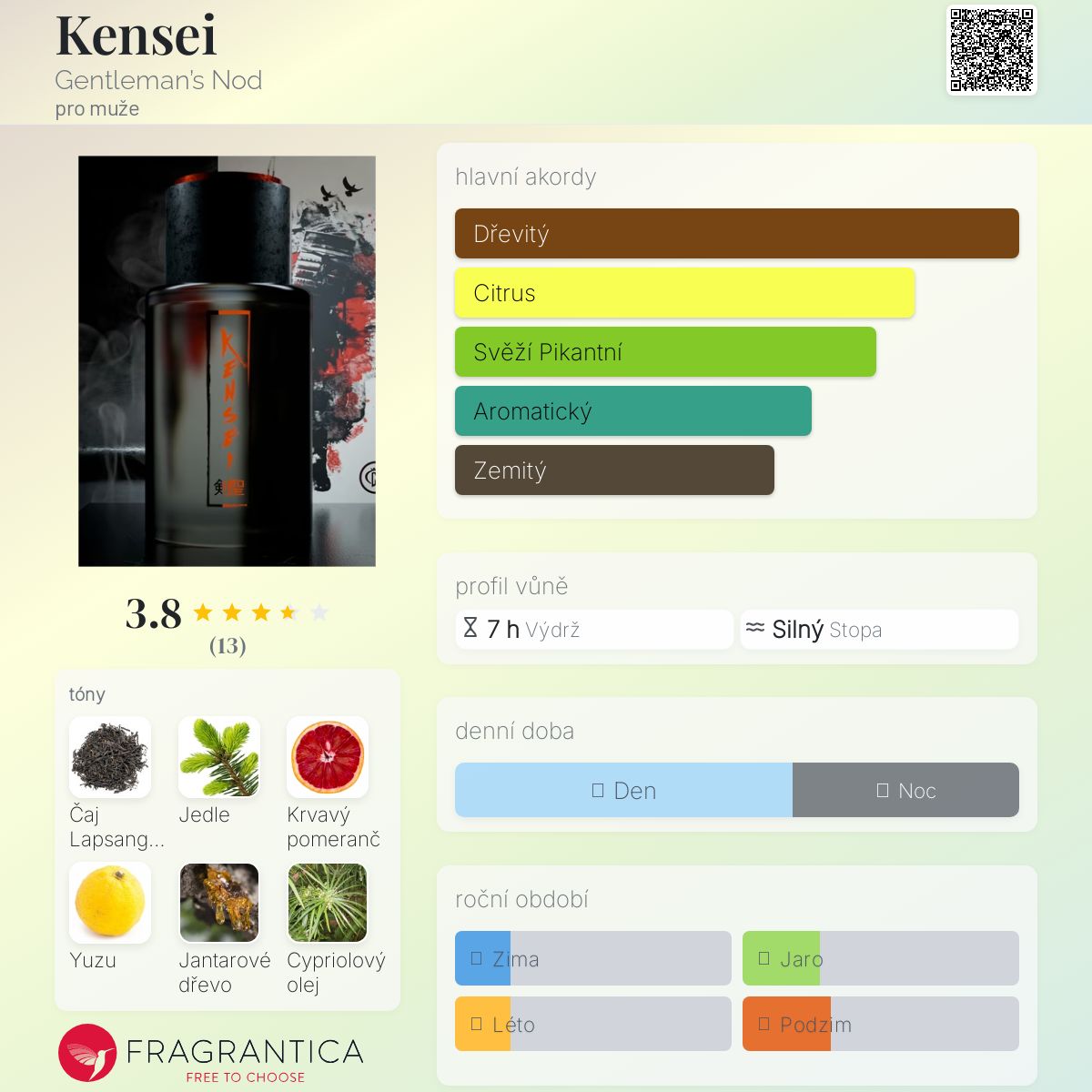 Kensei podle Gentleman’s Nod je vůně pro muže. Toto je nová vůně. Kensei byl/a uveden/a v roce 2024. "Nosem" za touto vůní je Patricia Choux. Vrchní tóny jsou Krvavý pomeranč, Yuzu, Žlutá mandarinka a Nashi hruška; střední tóny jsouČaj Lapsang souchong, Neroli, Černý pepř a Fialka ; základní tóny jsou Jedle balzámová, Jantarové dřevo, Cypriolový olej, Cedr, Vetiver a Šafrán.