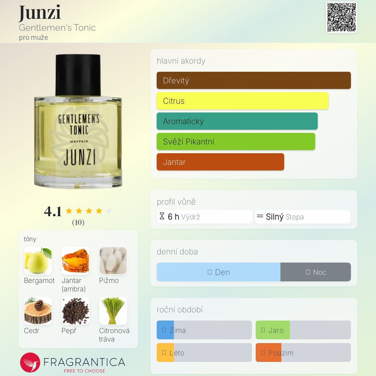 Junzi podle Gentlemen's Tonic je Aromatic Fougere vůně pro muže. Junzi byl/a uveden/a v roce 2015. Vrchní tóny jsou Bergamot, Černý pepř, Citronová tráva a Koňak; střední tóny jsouRůže, Šalvěj muškátová a Levandule ; základní tóny jsou Jantar (ambra), Pižmo, Cedr, Vetiver, Papyrus a Dubový mech.