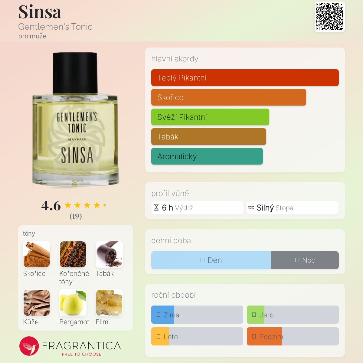 Sinsa podle Gentlemen's Tonic je Orientální Fougere vůně pro muže. Sinsa byl/a uveden/a v roce 2015. Vrchní tóny jsou Bergamot, Elimi, Černý pepř, Růžový pepř a Grapefruit; střední tóny jsouSkořice, Koření a Jasmín ; základní tóny jsou Tabák, Kůže, Jantar (ambra), Vanilka, Cedr, Vetiver a Pižmo.