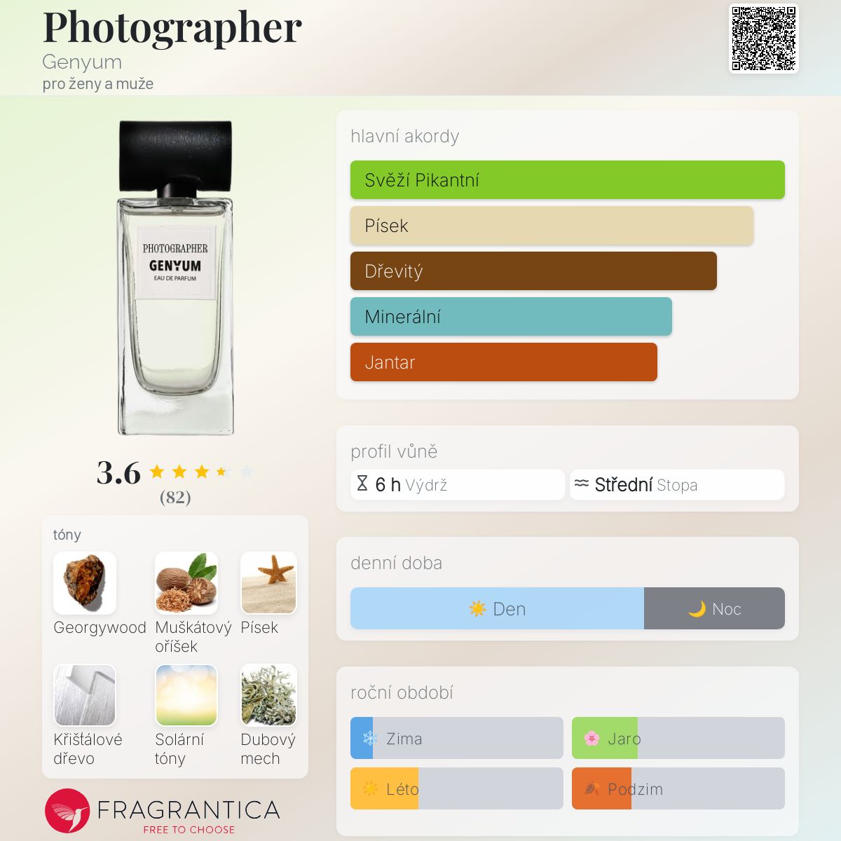Photographer podle Genyum je Woody Spicy vůně pro ženy a muže. Toto je nová vůně. Photographer byl/a uveden/a v roce 2024. "Nosem" za touto vůní je Amelie Jacquin. Vrchní tóny jsou Muškátový oříšek, Růžový pepř a Kardamom; střední tóny jsouPísek, Křišťálové dřevo a Solární tóny ; základní tóny jsou Georgywood, Mech, Jantar (ambra) a Vanilka.