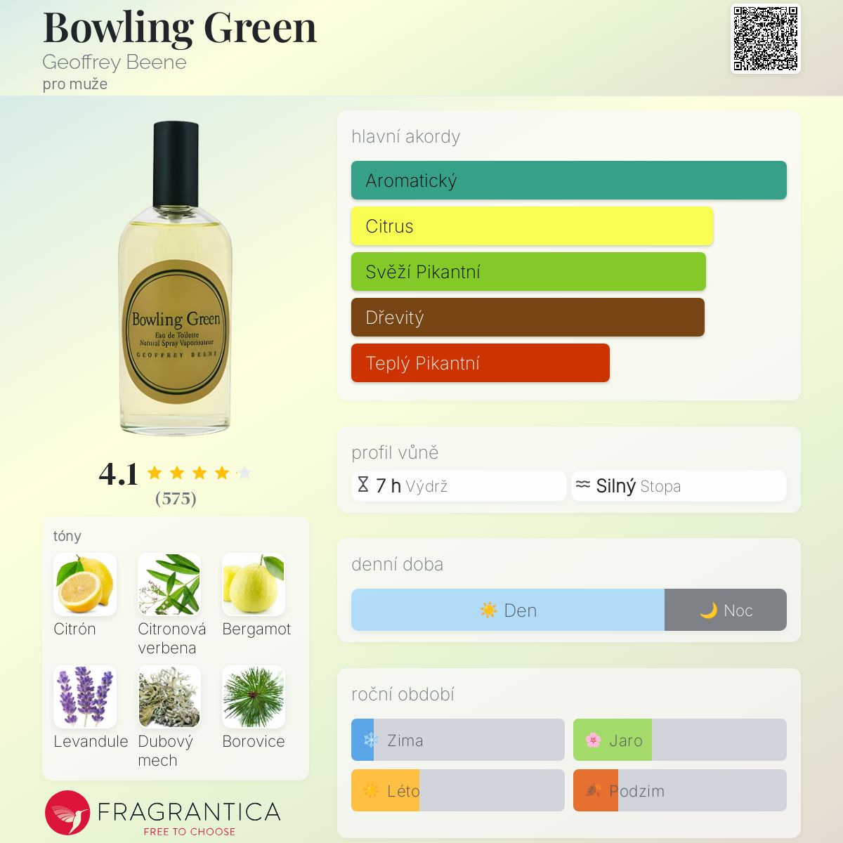 Bowling Green podle Geoffrey Beene je Woody Spicy vůně pro muže. Bowling Green byl/a uveden/a v roce 1986. Vrchní tóny jsou Citrón, Bergamot, Hřebíček, Pomeranč, Jalovcové bobulky, Ovocné tóny, Bazalka a Vetiver; střední tóny jsouCitronová verbena, Levandule, Dubový mech, Jehličí borovice, Muškátový oříšek, Šalvěj, Pelyněk, Kardamom, Skořice a Jasmín ; základní tóny jsou Dubový mech, Jedle, Pelargónie, Rozmarýn, Koriandr, Santalové dřevo, Pačuli, Cedr, Jantar (ambra) a Brazilské růžové dřevo.