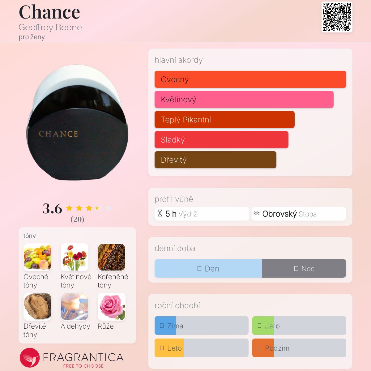 Chance podle Geoffrey Beene je Floral Fruity vůně pro ženy. Chance byl/a uveden/a v roce 1994. "Nosem" za touto vůní je Sophia Grojsman. Vrchní tóny jsou Ovocné tóny, Květinové tóny a Aldehydy; střední tóny jsouKoření, Růže a Broskev ; základní tón je Dřevité tóny.