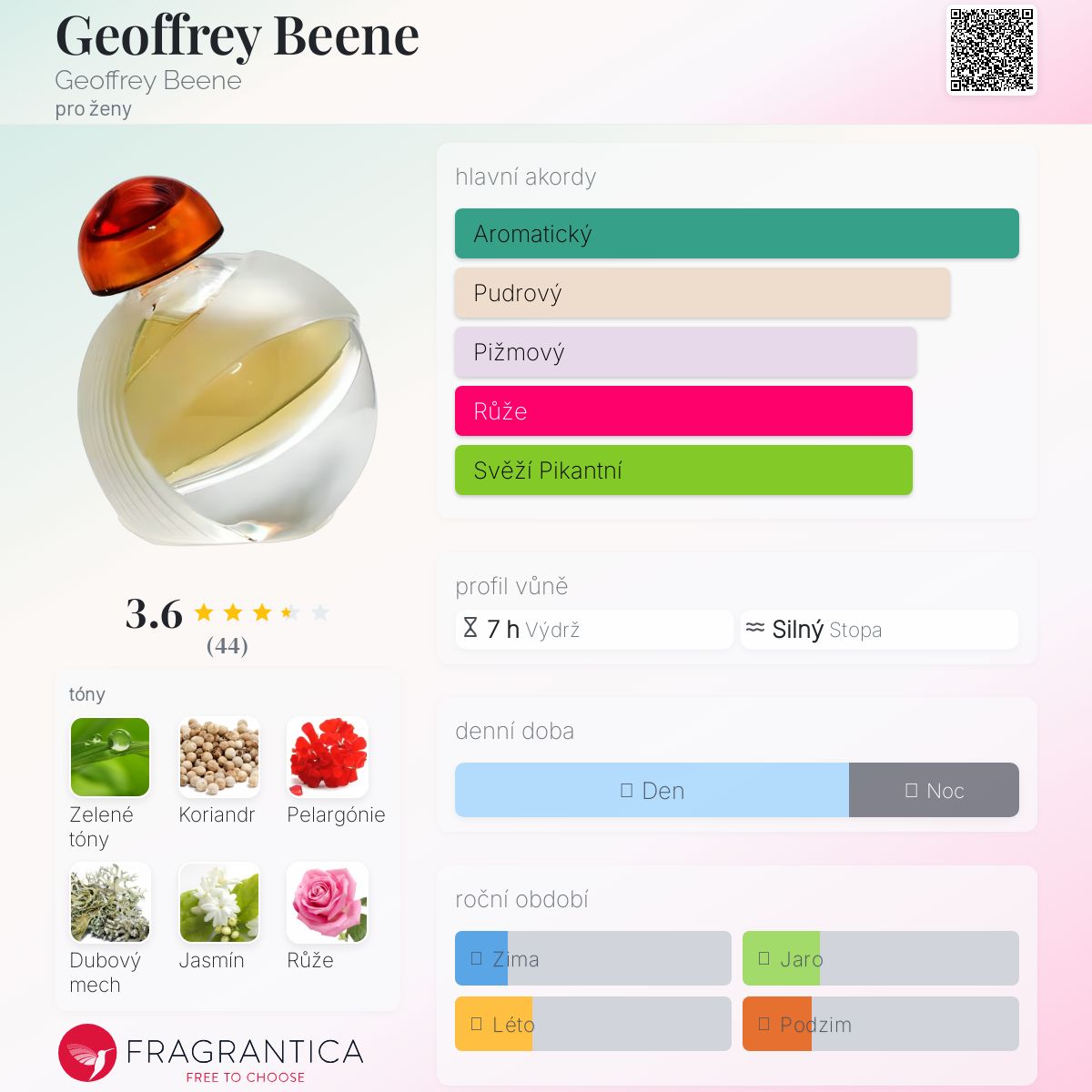 Geoffrey Beene podle Geoffrey Beene je Floral vůně pro ženy. Geoffrey Beene byl/a uveden/a v roce 1998. Geoffrey Beene byl/a vytvořen/a Michel Gouges a Ron Winnegrad. Vrchní tóny jsou Zelené tóny, Koriandr a Bergamot; střední tóny jsouPelargónie, Jasmín, Růže a Fialka ; základní tóny jsou Dubový mech, Pižmo, Santalové dřevo a Cibetka.