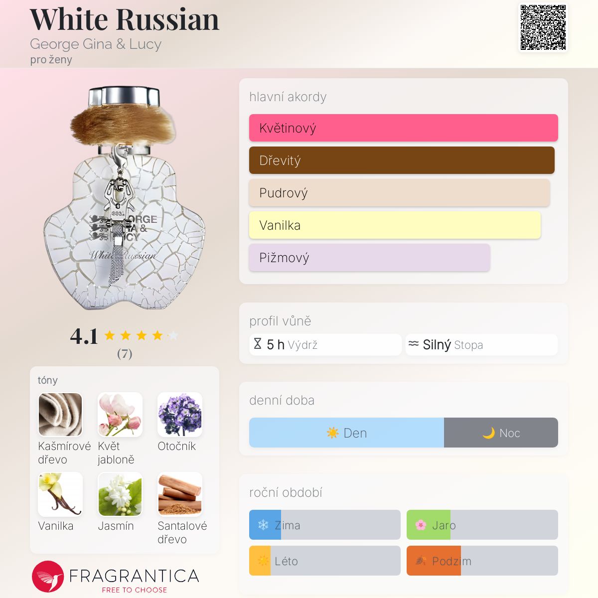 White Russian podle George Gina & Lucy je Floral Woody Musk vůně pro ženy. White Russian byl/a uveden/a v roce 2013. Vrchní tóny jsou Květ jabloně a Červené bobule; střední tóny jsouOtočník, Jasmín, Bílá růže a Frézie ; základní tóny jsou Kašmírové dřevo, Vanilka, Santalové dřevo a Pižmo.